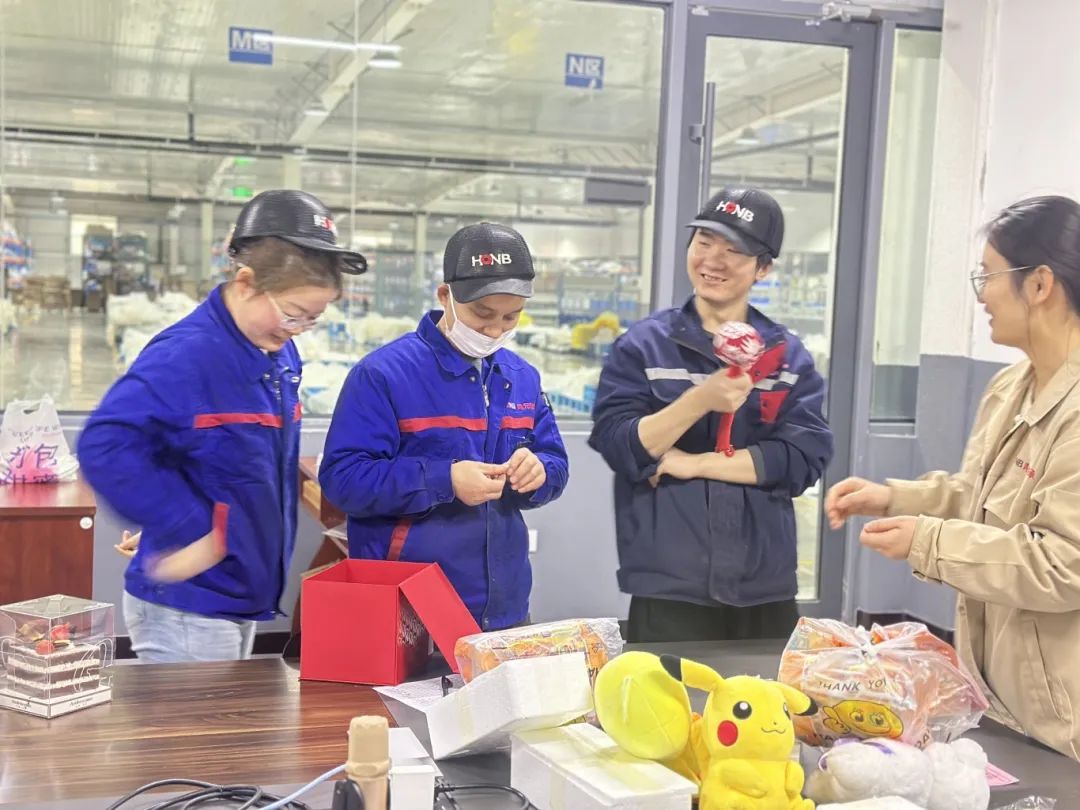 人資小伙伴們早早備好蛋糕與禮物。松軟蛋糕上,象征希望的蠟燭輕輕搖曳,包裝精美的禮物滿含心意,每一件都精心挑選。它們承載著溫暖關懷,讓大家在鴻元感受家的溫馨。