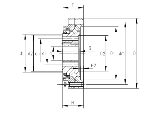 | d | D | H | C | B | H2 | D1 | D2 | d1 | d2 | 中心徑dm | 安裝孔尺寸 | 中心徑dn | 安裝孔尺寸 | 中心徑dL | 安裝孔尺寸 | Cr | Cor | KG | ||